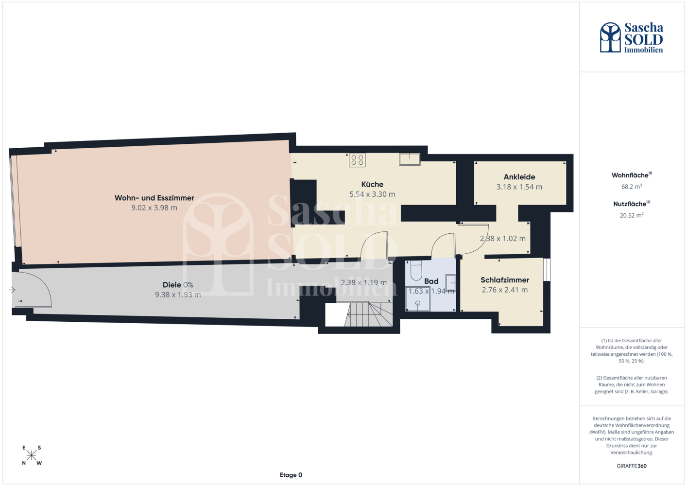 Alle Informationen basieren auf den Angaben des Eigentümers. Eine eigene Berechnung der Wohnfläche durch den Makler hat nicht stattgefunden. Die im Exposé angegebenen Wohn- und Nutzflächen sowie die dargestellten Grundrisse wurden nicht gemäß der Wohnflächenverordnung (WoFlV) eigenständig ermittelt. Sie basieren auf der digitalen 3D-Scan-Technologie der Giraffe360 Limited und stellen keine verbindliche Wohnflächenberechnung oder Architektenleistung dar. Für die Richtigkeit, Vollständigkeit und Maßhaltigkeit der Flächenangaben wird keine Gewähr übernommen. Dies gilt ebenso für die Angaben zum Energieausweis und zu den energetischen Eigenschaften, die ebenfalls auf den Daten des Eigentümers basieren und nicht eigenständig geprüft wurden. Angaben zu Heizungsanlagen, Technik oder sonstiger Ausstattung wurden ebenfalls nicht geprüft. Fotos, Videos, virtuelle Rundgänge, 3D-Darstellungen und Grundrisse dienen nur der Illustration, sind nicht maßstabgetreu und ersetzen keine persönliche Vor-Ort-Besichtigung oder Prüfung. Das Exposé sowie die darin gemachten Angaben in Wort, Bild und Zahlen stellen keine Beschaffenheitsvereinbarung dar. Wert- und Maßangaben sind lediglich Circa-Angaben. Es hat keine Einsicht in die Bauakte stattgefunden. Kaufinteressenten sind verpflichtet, das Objekt selbst zu besichtigen und alle relevanten Unterlagen eigenständig zu prüfen. Es wird keine Gewähr für die baurechtliche Zulässigkeit der Nutzung oder für vorhandene Genehmigungen übernommen. Kaufinteressenten müssen die Bebauungspläne und das Baurecht selbst prüfen. Bekannt gewordene Fehler werden umgehend korrigiert. Der Makler übernimmt keine Haftung für die Richtigkeit und Vollständigkeit der Angaben. Änderungen, Irrtümer und Zwischenverkauf bleiben vorbehalten.