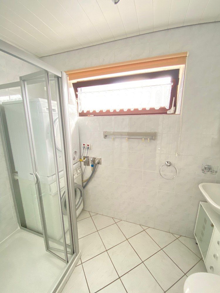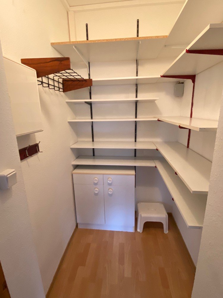 Sie betreten das erste Zimmer, also ein Durchgangszimmer, und gelangen von dort in den zweiten Raum der Wohnung, an den das Duschbad (mit Fenster) und die Küche angrenzen. Eine Einbauküche und Waschmaschine und Trockner sind bereits vorhanden. Der große Abstellraum fungiert quasi als beghbarer Kleiderschrank. Vor der Wohnung befindet sich eine gemütliche, ca.