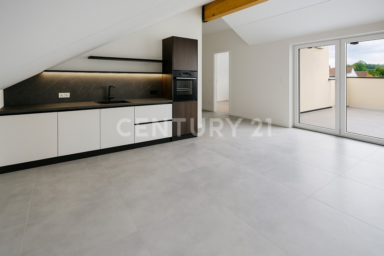 Das Herzstück der Wohnung ist der großzügige Wohn- und Essbereich mit integrierter Küche, der durch seine offene Gestaltung ein besonders einladendes Ambiente schafft. Große Fensterfronten fluten den Raum mit Licht und führen direkt hinaus auf den herrlichen Balkon, der zum Entspannen im Freien einlädt. Ein charmantes Balkenelement verleiht dem Wohnbereich zusätzlich eine warme und unverwechselbare Note und verbindet modernen Neubaukomfort mit gemütlicher Wohnatmosphäre.