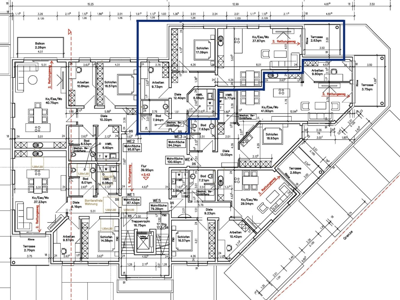 Ein besonderes Highlight ist der großzügige Eingangsbereich auf jeder Etage, der ein Gefühl von Offenheit und Eleganz vermittelt - vergleichbar mit dem stilvollen Empfangsbereich eines Hotels. Diese Wohnung (Nr.3) bietet eine Wohnfläche von 94,24 m2 und ist durchaus großzügig geschnitten.