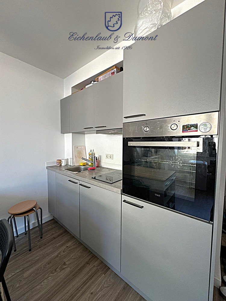 Die Wohnung verfügt über eine Diele, die beide Zimmer miteinander verbindet. Das erste Zimmer ist als Wohn- und Essbereich gestaltet und mit einer modernen Einbauküche inklusive Elektrogeräten ausgestattet.
