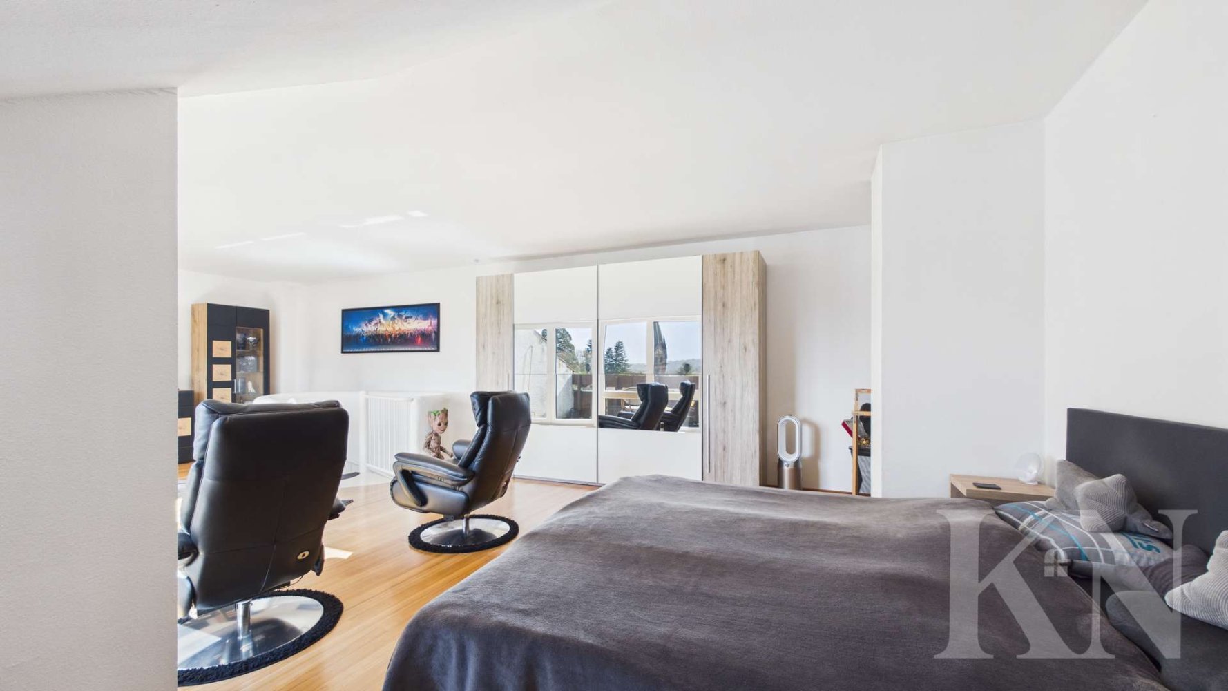 Ein echtes Highlight ist der großzügige Wohn- und Schlafbereich im Obergeschoss mit direktem Zugang zur Loggia – ein perfekter Rückzugsort. Ergänzt wird das Raumangebot durch einen Balkon im unteren Bereich, der zusätzlichen Platz im Freien bietet.